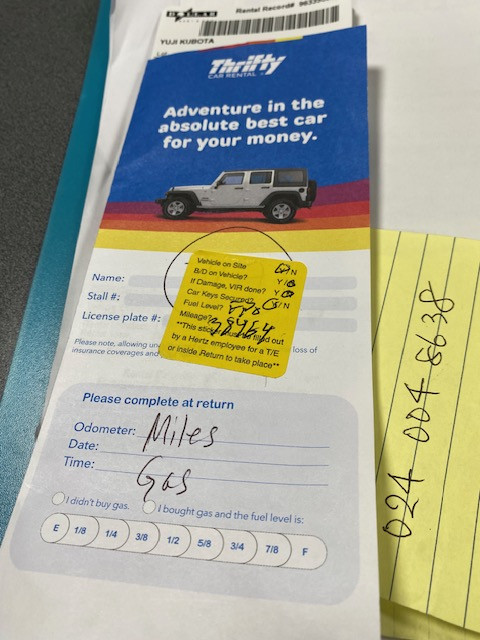 ①ダラーレンタカーの右ミラーの破損のため、車の交換は、一切費用がかからなかったです。やはり、レンタカーの保険のフルカバーをしていたので、良かったです。写真の黄色シールが貼られて手続きが終わりました。