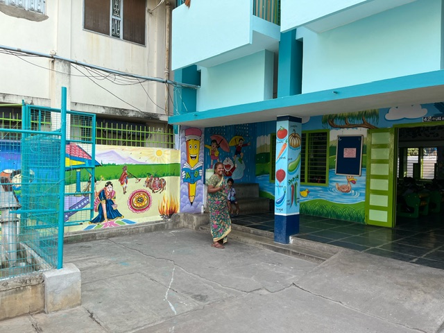小学部の校舎、ドラえもんの壁絵があります。 {CAPTION}