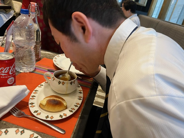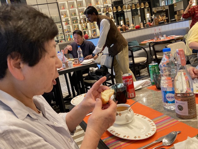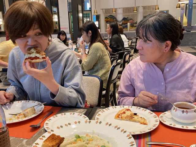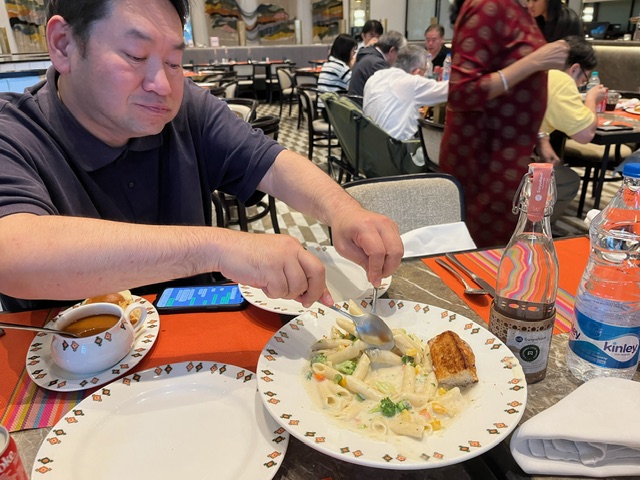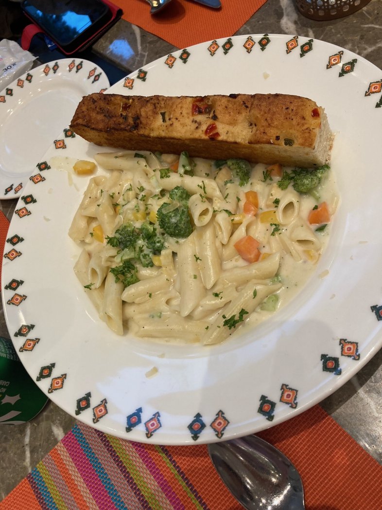 昨晩のインド風イタリアン クリームパスタにトーストした甘いパンがついてます。 トマトコリアンダースープ。とても美味しいです。 皆、お腹守られ、元気でいただいてます。 この後、ピザでしたが、撮る前に食べちゃいました。感謝です。