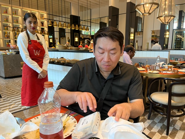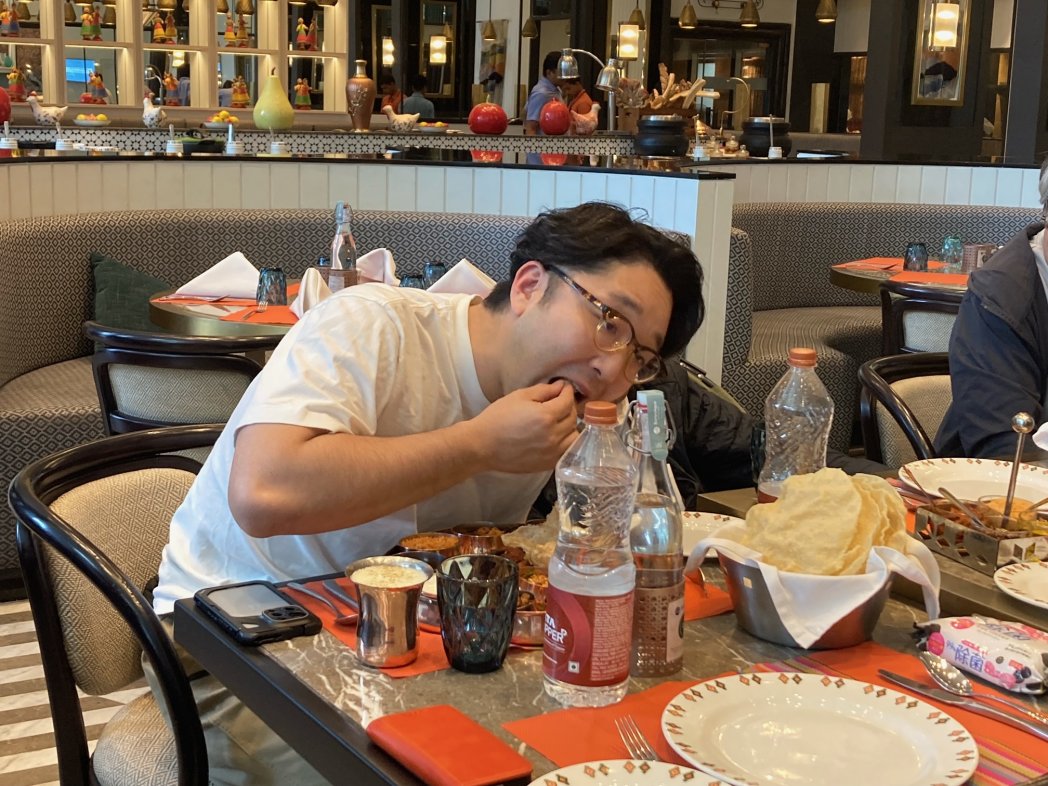 お昼に本当のインドのカレーが!代表でヨハネさんが、ディップして、勇敢にトライ。