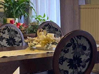 素敵な広い部屋で、キャンドルがともり、晩餐会のようです。