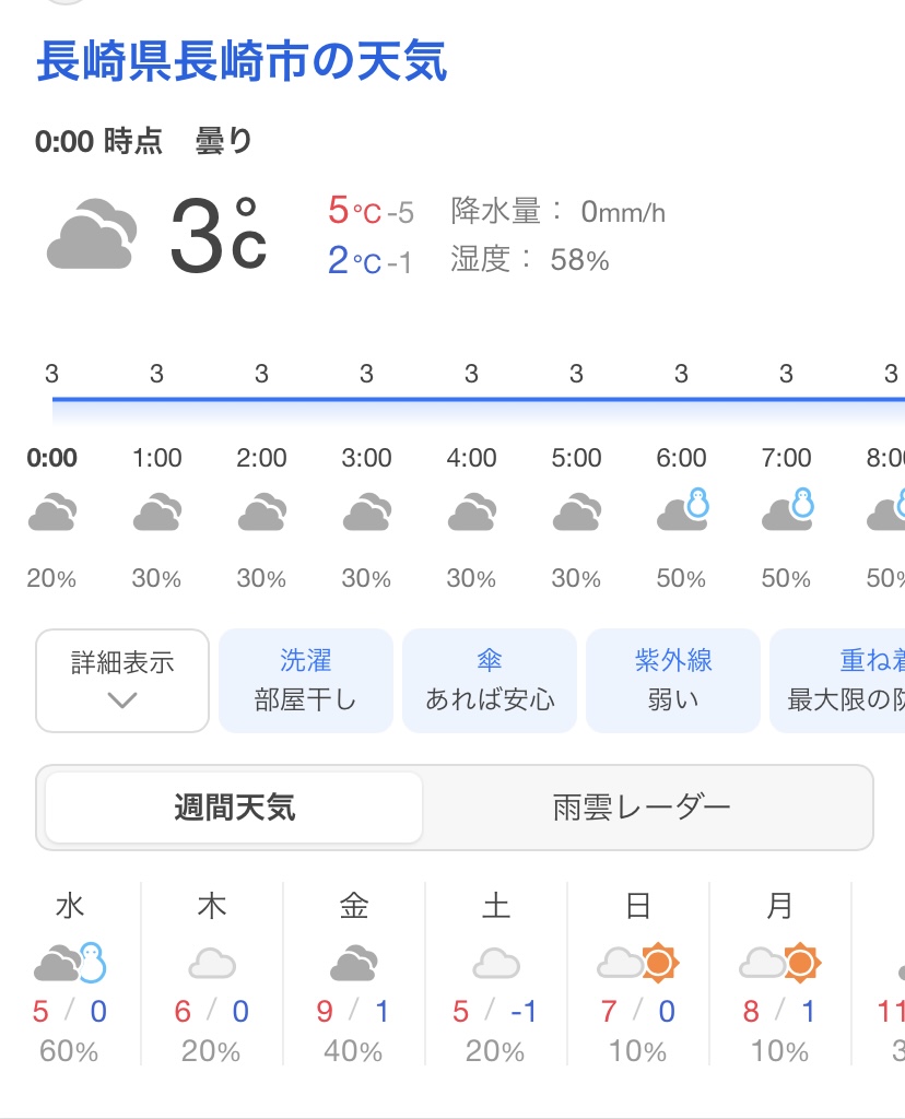 長崎市の天気が気になります。 2025年2月4日 00:31 / 2月6日からのハリウッドチームの前日に、 長崎市に行きます。天気予報では、雪という こと。非常に気になります。良い天気であります様に。peter iPhoneから送信