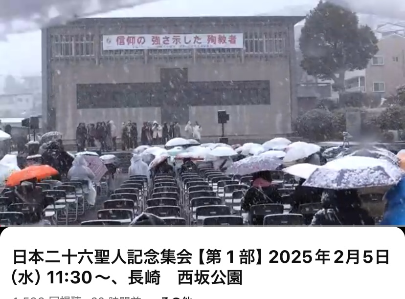 ハリウッドチーム前日に、東京から長崎日帰りして 2025年2月6日 07:36 / 2025年2月5日に長崎市西坂で行われた 26聖人の殉教記念集会の第1部、第2部に参加しました。吹雪もありましたが,非常に印象的な集会となりました。今日からは,その26聖人をハリウッドからアニメ映画で出す!に,向けてハリウッドへ、踏み込みます。お祈りをよろしくお願いします。peterk iPhoneから送信