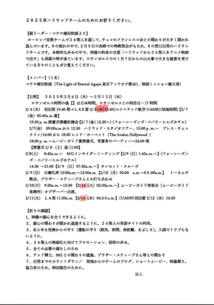ハリウッドチームの祈りの課題の訂正です。 2025年2月6日 07:55 / ピンク色が誤りです。 上から言うと正しくは、 ①2/6(木) ②2/12(火) ③2/12(水) すみません。 peterk iPhoneから送信