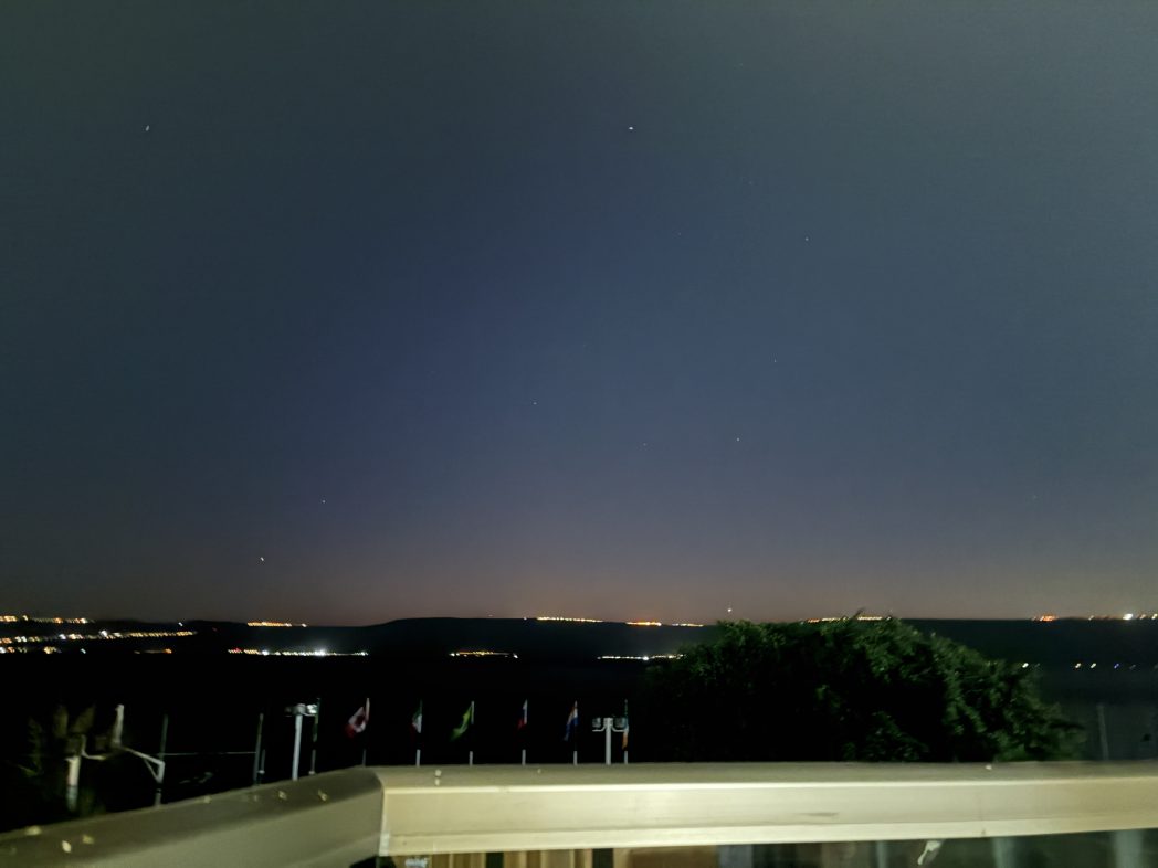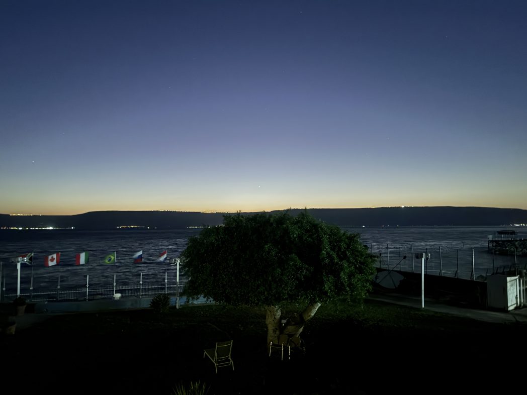 対岸の光、虫の声、打ち寄せる水の音。 ガリラヤ湖は生きて、動いています。 その豊かな生命力、主の力に包まれ、癒されます。 北斗七星のひしゃくが見下ろしています。 新しい朝、期待にみちあふれ。 全員守られてます。お祈り感謝。