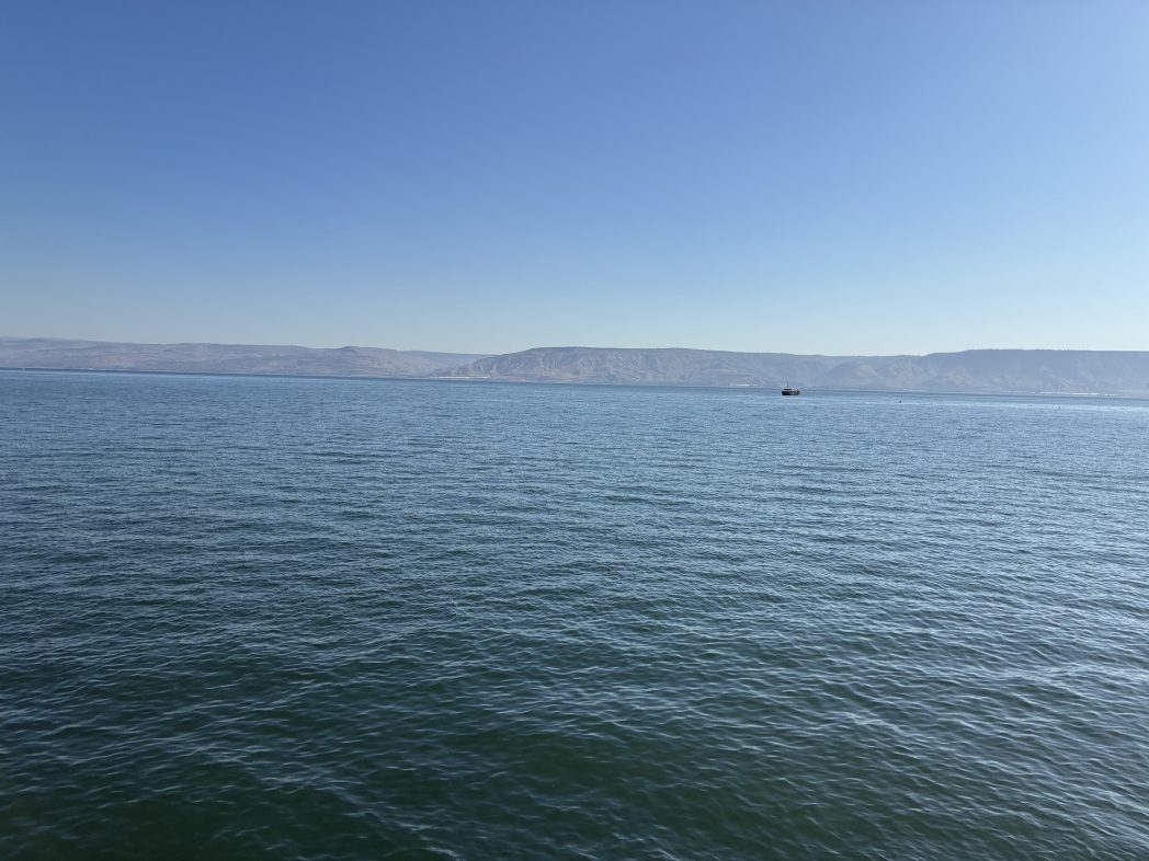 すっかり明るくなり、強い日差しの中、ガリラヤ湖畔に。打ち寄せる水の音を聴きながら、思いは神さまへ、イエスさまへ導かれていきます。 向こう岸をみながら、向こう岸へ渡ろうという主のことば、向こうで起こった大きなわざを思い起こしています。